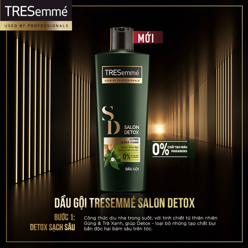 TRESemmé là nhãn hiệu chăm sóc tóc cao cấp đến từ Mỹ, được sử dụng bởi các chuyên gia tại Tuần lễ Thời trang New York – New York Fashion Week. Dầu gội TRESemmé Salon Detox với công thức chứa thành phần thiên nhiên gồm gừng và trà xanh, giúp Detox* và nuôi dưỡng tóc, giúp khôi phục lại mái tóc chắc khỏe đẹp chuẩn Sàn